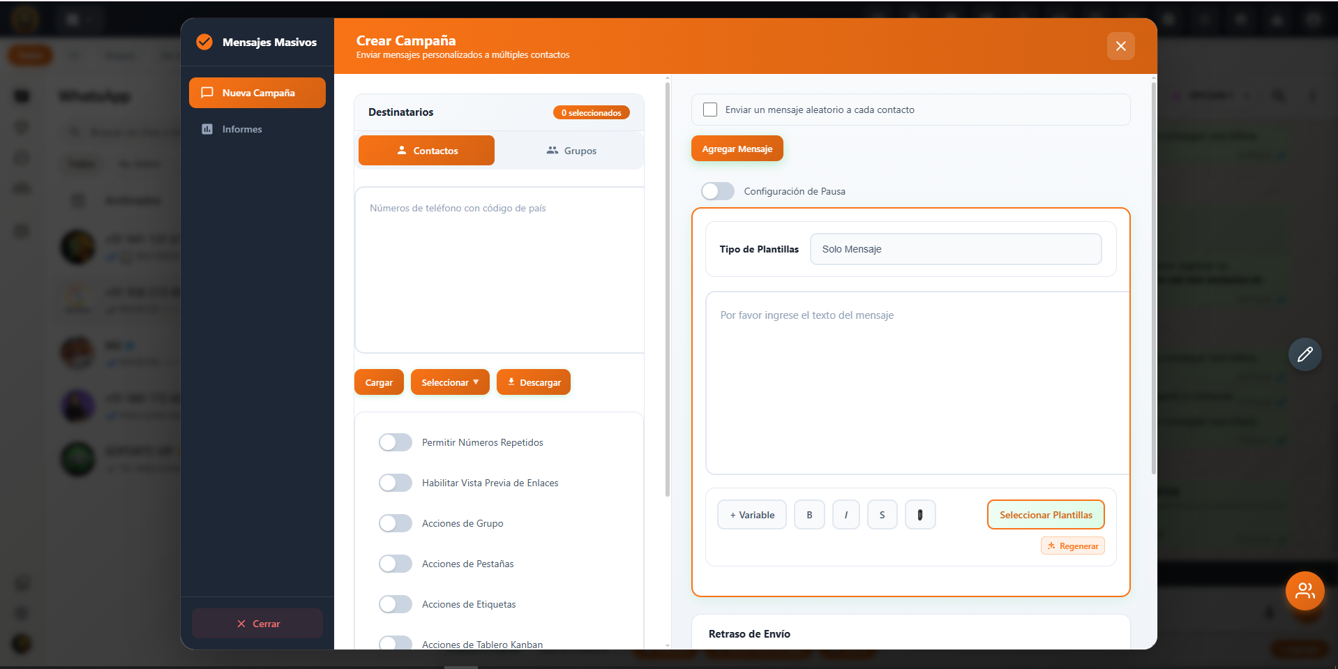Envía mensajes personalizados de WhatsApp a miles de contactos en minutos. La función de Mensajería Masiva de Lion CRM te permite importar contactos mediante CSV, grupos, etiquetas, pestañas o tableros Kanban, lo que te ofrece total flexibilidad. Crea plantillas reutilizables con variables dinámicas , establece pausas inteligentes entre mensajes para proteger tu cuenta y envía varias campañas simultáneamente . Monitorea todo con informes detallados de campaña que muestran el estado de entrega, los mensajes fallidos y el historial completo.
