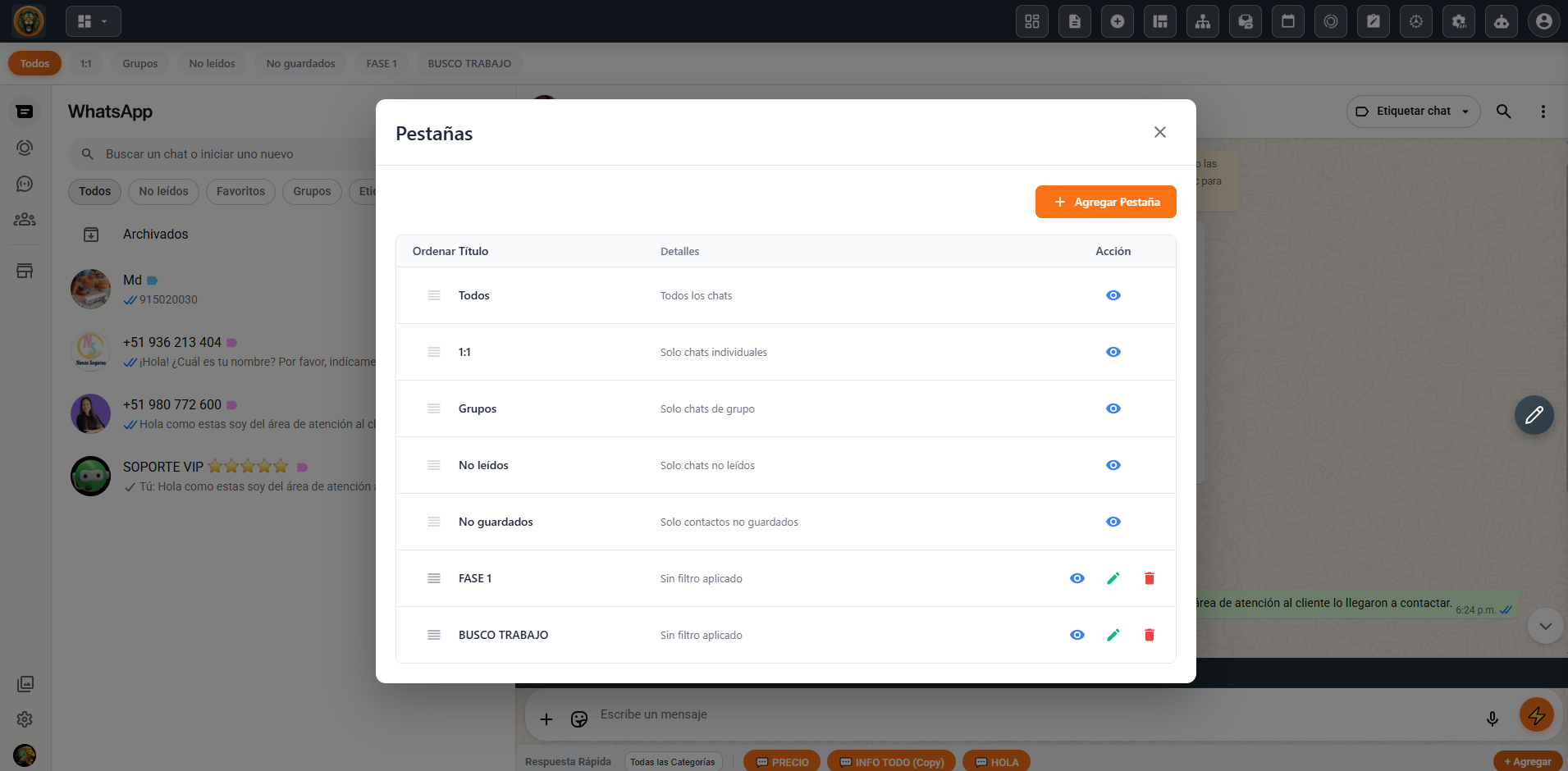 Organiza tus conversaciones de WhatsApp como nunca antes con la función Pestañas de Lion CRM . Crea pestañas personalizadas para categorizar y gestionar tus chats fácilmente. Agrega chats individuales, grupos completos o contactos etiquetados directamente en cualquier pestaña para una organización impecable. Ya sea que gestiones leads, consultas de soporte o clientes VIP, el 100% de tus contactos se agregarán sin límite. Mantente organizado y productivo.