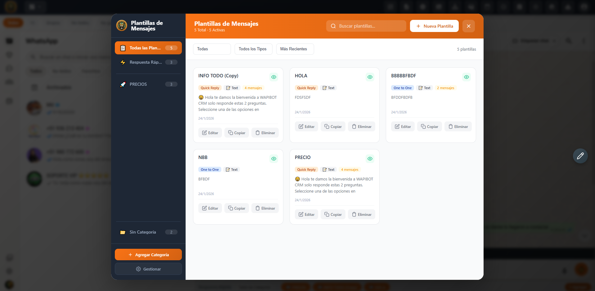 Crea potentes plantillas de mensajes reutilizables con la función avanzada de Plantillas de Lion CRM . Elige el propósito de tu plantilla : chats individuales, pestañas, grupos, etiquetas, tableros Kanban o respuestas rápidas . Personaliza el tipo de plantilla : Solo mensaje, Mensaje + Imagen/Video, Mensaje + Documentos, Mensaje + Audio, Mensaje + Contactos, Mensaje + Encuestas, Mensaje + Lista o Mensaje + Producto . Crea una vez, úsala en todas partes.
