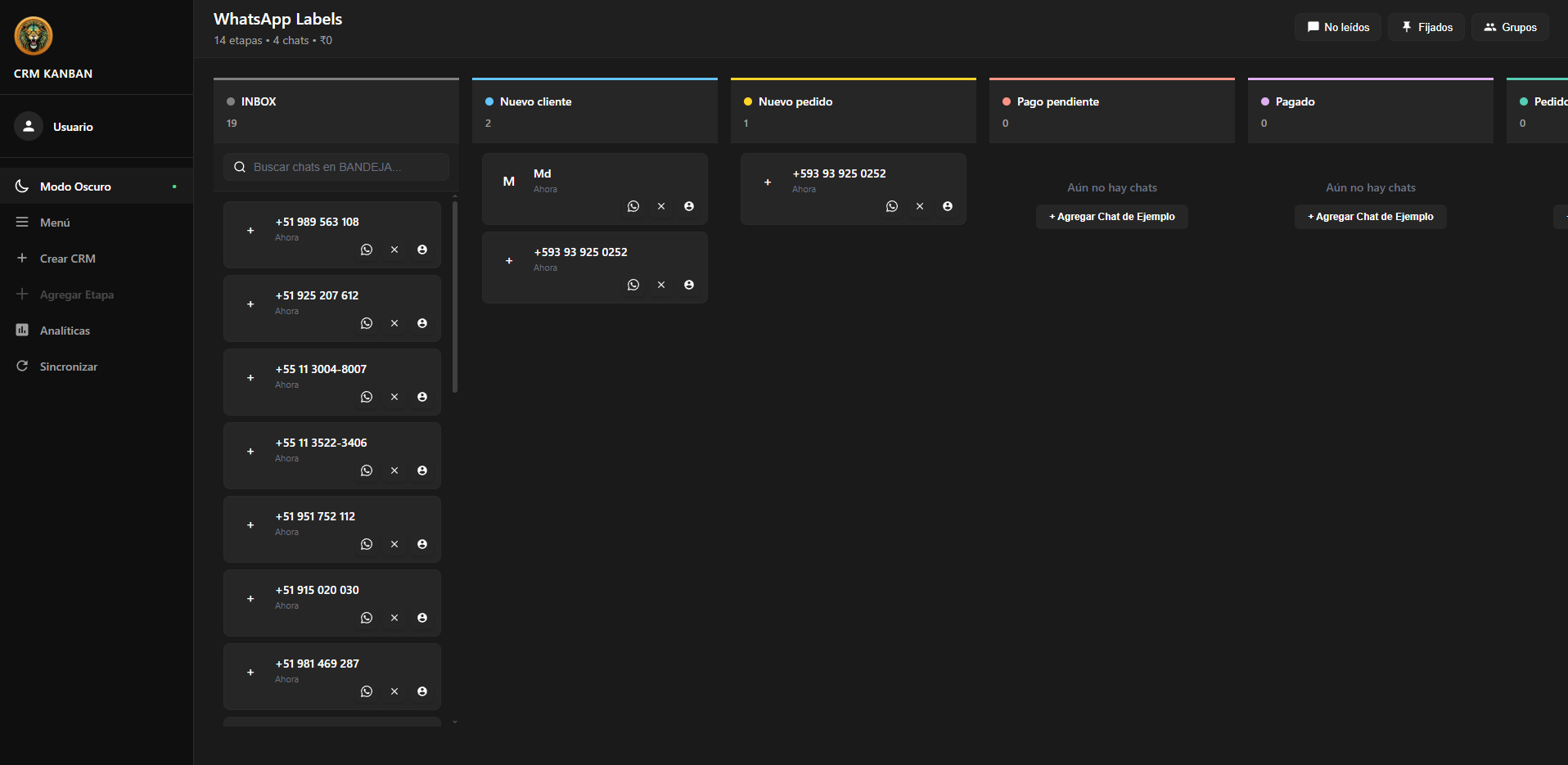 Visualiza y gestiona tu flujo de ventas fácilmente con la función Tablero Kanban de Lion CRM . Accede al menú para cambiar entre el Modo Oscuro y el Modo Claro y disfrutar de una visualización cómoda. Crea y gestiona etiquetas de WhatsApp y pestañas personalizadas directamente desde el menú. Crea nuevos tableros de CRM con la opción “Nuevo CRM” para dar seguimiento a diferentes proyectos. Añade etapas personalizadas con la opción “Nueva Etapa” para adaptarlas a tu proceso de ventas, desde la captación de leads hasta el cierre de ventas.